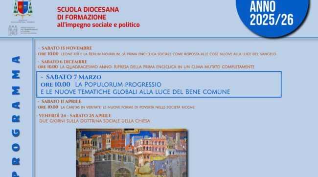 Scuola diocesana all’impegno sociale e politico: il terzo incontro, precedentemente in programma per sabato 21 febbraio, è stato rimandato a sabato 7 marzo. Avrà come titolo «La Populorum progressio e le nuove tematiche globali alla luce del Bene comune».Tutti gli…