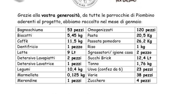Come ogni mese, la Caritas diocesana ha pubblicato il resoconto relativo alle donazioni ricevute dalle comunità parrocchiali di Piombino aderenti al progetto. Per verificare le serie storiche è sufficiente digitare il link seguente: https://www.diocesimassamarittima.it/category/caritas/ Richieste per Febbraio…