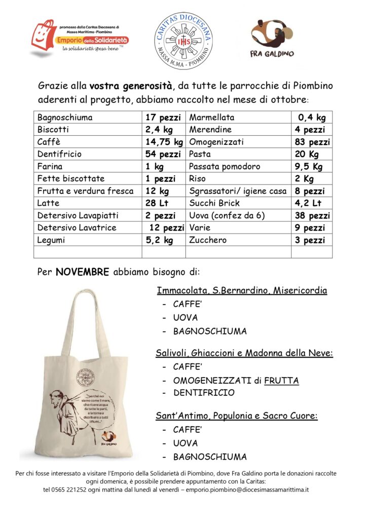Per sapere di più sul progetto Fra Galdino e quali chiese a Piombino hanno aderito all’iniziativa diventando Punti di Raccolta, contatta la la Caritas diocesana: