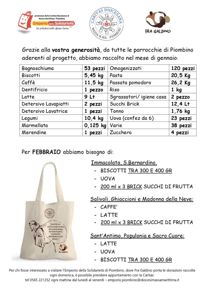 Per sapere di più sul progetto Fra Galdino e quali chiese a Piombino hanno aderito all’iniziativa diventando Punti di Raccolta, contatta la la Caritas diocesana: