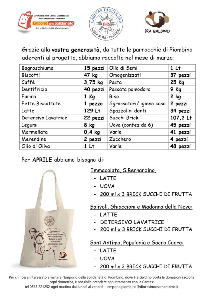 Per sapere di più sul progetto Fra Galdino e quali chiese a Piombino hanno aderito all’iniziativa diventando Punti di Raccolta, contatta la la Caritas diocesana: