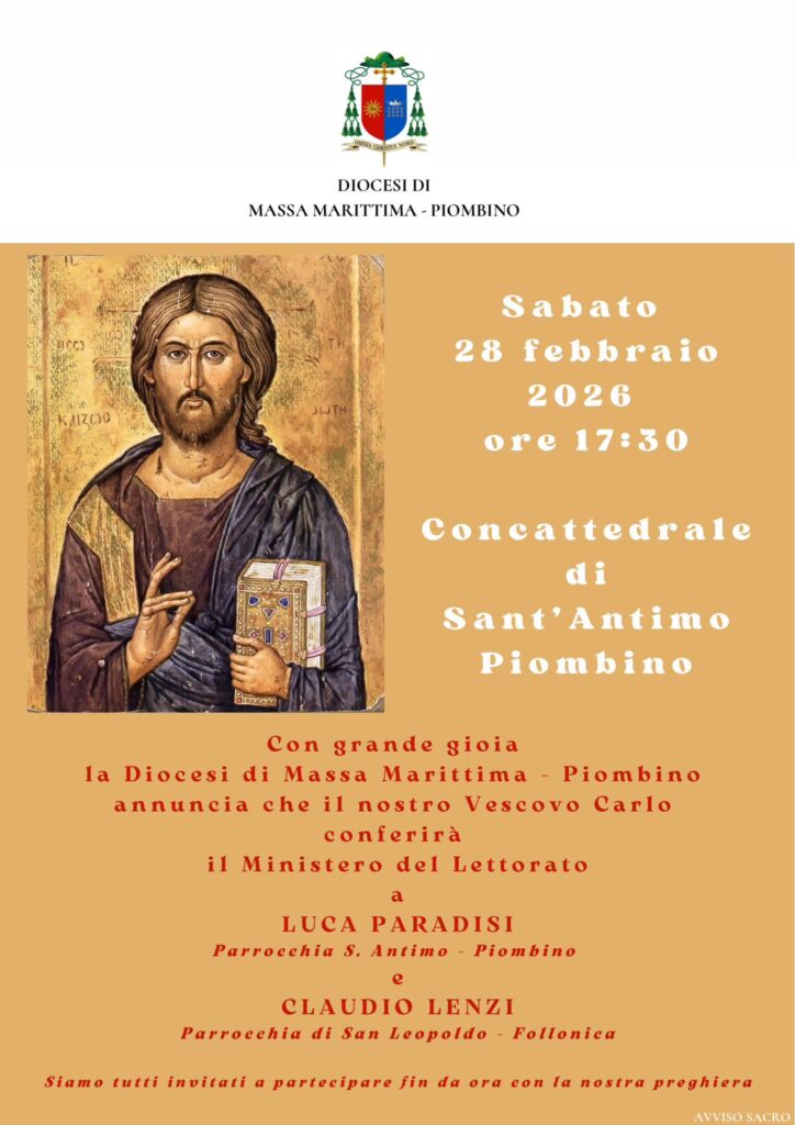 Sabato 28 febbraio, nella chiesa concattedrale di Sant’Antimo a Piombino, alle 17.30, il nostro vescovo Carlo conferirà il ministero del lettorato a Luca Paradisi e Claudio Lenzi. La comunità è invitata a partecipare.