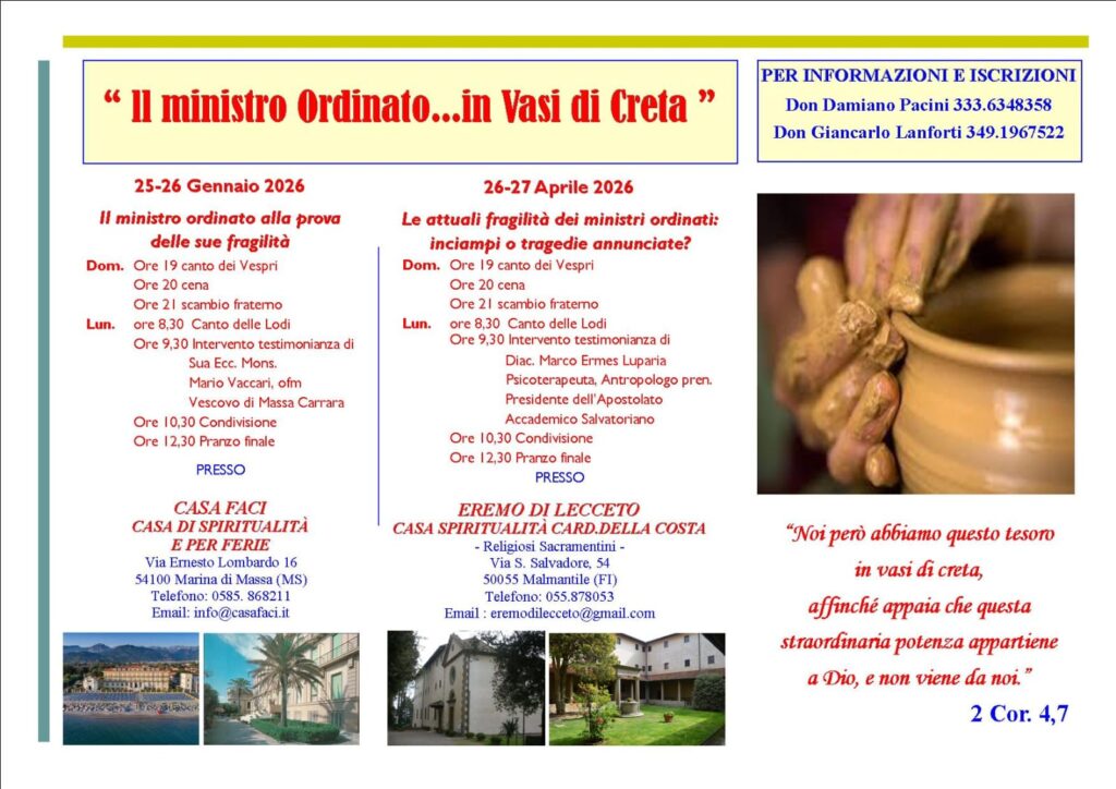 Due proposte di formazione e riflessione per i ministri ordinati. Le giornata sono organizzate da Faci e Uac. La prossima si svolgerà dal 26 al 27 aprile presso l’Eremo di Lecceto. Tutti i dettagli sono nella locandina allegata.