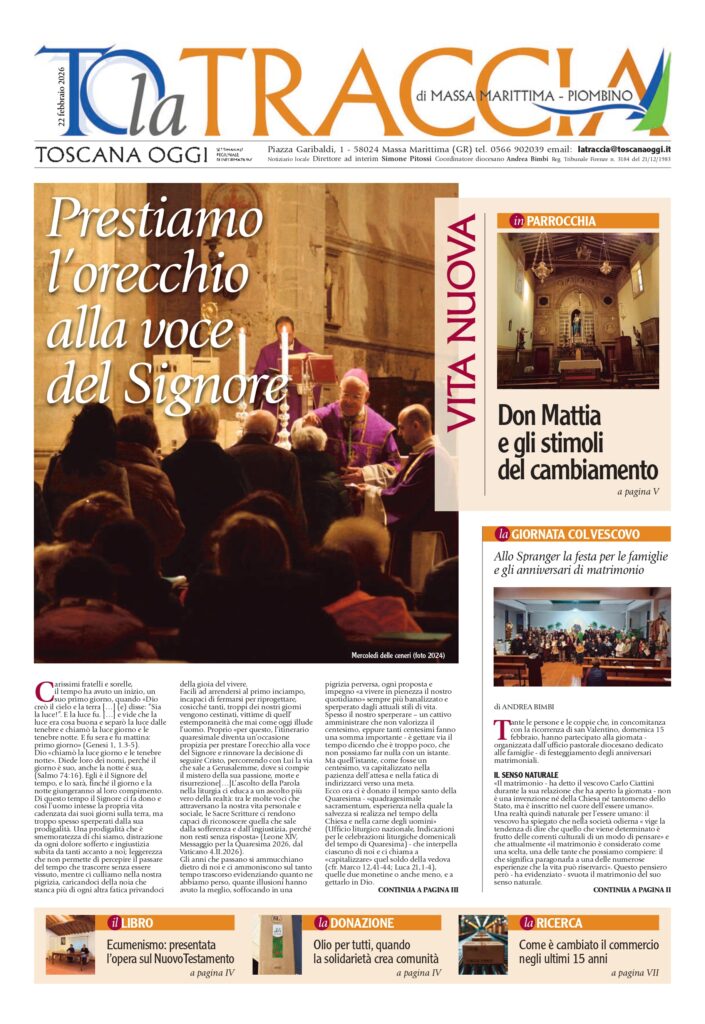 Il messaggio del nostro vescovo Carlo per la Quaresima. La festa per gli anniversari di matrimonio e la presentazione del libro sulla “traduzione letteraria ecumenica del nuovo testamento”. Nuova vita in parrocchia: l’intervista a don Mattia. I cambiamenti del commercio nelle province di Grosseto e Livorno negli ultimi 15 anni e tante altre notizie di attualità all’interno.
