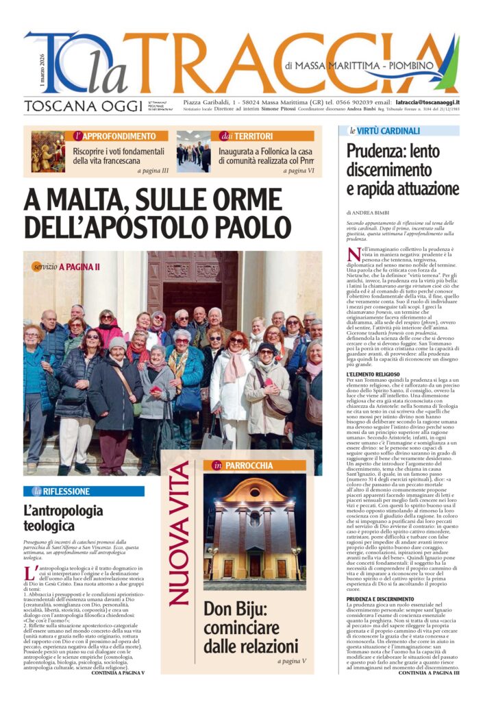 La seconda riflessione sulle virtù cardinali: la prudenza. A Malta il pellegrinaggio sulle orme di san Paolo del vicariato elbano. Nuova vita in parrocchia: l’intervista a don Biju. L’approfondimento sulla vita francescana e lo “sguardo sui giovani” proposto all’interno del progetto PEPE. Gli incontri di catechesi a San Vincenzo e tante notizie di attualità all’interno.