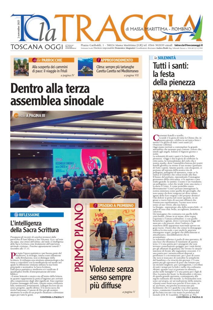 Solennità di tutti i santi: il messaggio del nostro vescovo Carlo. I delegati diocesani raccontano la terza assemblea sinodale. La parrocchia di Salivoli in pellegrinaggio in Friuli, scoprendo territori di riconciliazione. Il tema della violenza tra i giovani, i movimenti delle tartarughe marine come effetto del cambiamento climatico e tante altre notizie all’interno.