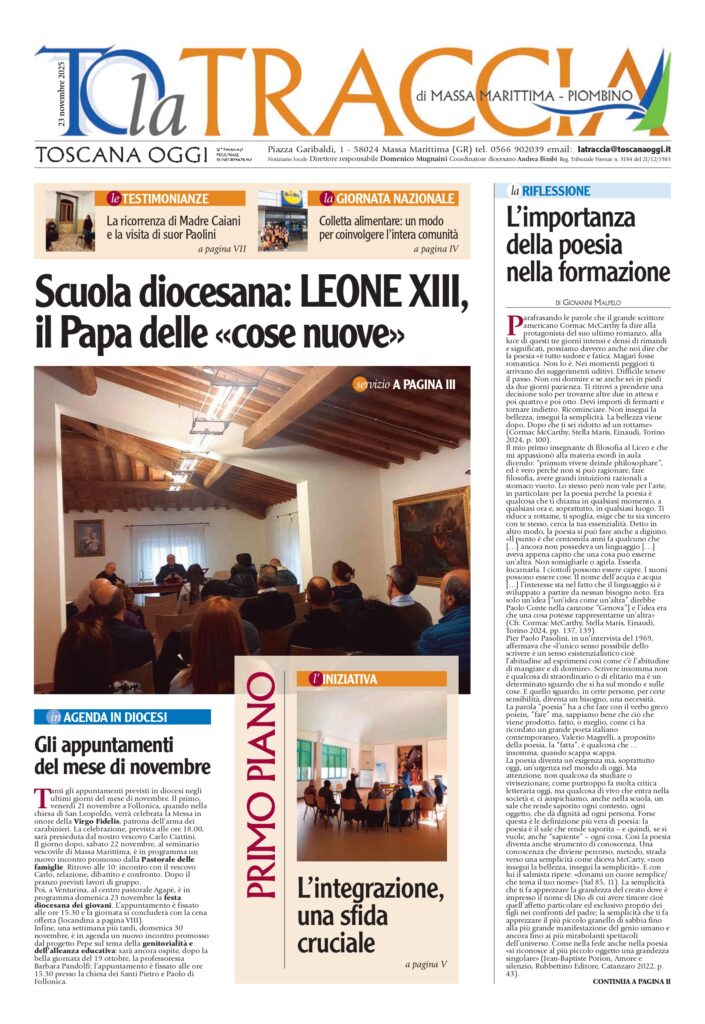 Il primo incontro della scuola diocesana sulla figura di papa Leone XIII. La giornata mondiale dei poveri: un progetto della Caritas che mira all’integrazione. Le foto e il racconto della Colletta Alimentare. Anche qualche eco del corso di aggiornamento per gli insegnanti di religione: l’importanza della poesia nell’educazione e l’incontro del poeta Davide Rondoni. La ricorrenza di Madre Caiani, la testimonianza di suor Francesca Paolini, il capannone confiscato alla Malavita a Donoratico e tante altre notizie all’interno.