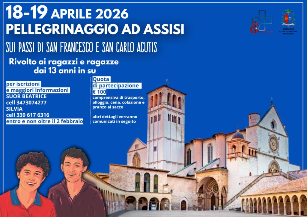 La Pastorale giovanile sta organizzando un pellegrinaggio ad Assisi “sui passi di san Francesco e san Carlo Acutis” dal 18 al 19 aprile. La quota richiesta è di euro 100 e comprende trasporto, alloggio, cena, colazione e pranzo al sacco. Le iscrizioni sono da confermare entro il 2 febbraio ai contatti riportati nella locandina allegata.