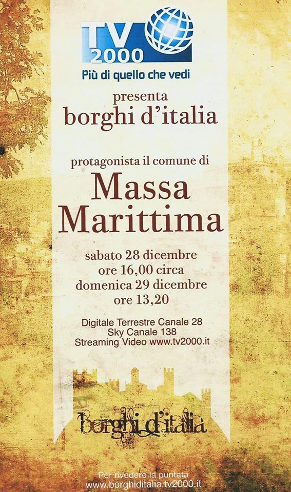 La nostra città di Massa Marittima è stata scelta dall’emittente televisiva TV2000 come uno dei più bei Borghi d’Italia e il mese scorso è stata protagonista di un bel servizio, girato tutto tra le sue mura. La troupe di TV2000 dopo aver preso contatti con l’Amministrazione Comunale è stata ospite della città metallifera per due giornate e ha ripreso gli angoli più caratteristici del centro storico basso ed alto, i musei, dall’archeologico a quello della miniera e la cattedrale, gettando poi uno sguardo sulla storia e sulle tradizioni massetane. La puntata di “Borghi d’Italia” andrà in onda sabato 28 dicembre alle 16 e domenica 29 dicembre alle 13,20 sul Canale 28 del Digitale Terrestre, sul Canale 138 di Sky o in streaming video su www.tv2000.it. Nel servizio di TV2000 si trovano infatti un bell’ approfondimento sulla Cattedrale di San Cerbone con un’intervista al parroco Don Sergio Trespi e al nostro Vescovo Monsignor Carlo Ciattini presso la Curia, interviste al sindaco Lidia Bai, alla responsabile del Sistema museale provinciale Roberta Pieraccioli, ad Antonella Santucci della Cooperativa Colline Metallifere che gestisce i musei di Massa Marittima e al rettore della Società dei Terzieri massetani Sandro Poli per terminare con i sapori tipici locali e la cornice dell’antica cantina della famiglia Moris, con un’intervista al fiduciario della condotta Slow Food Monteregio Fausto Costagli e ad alcuni produttori del territorio.