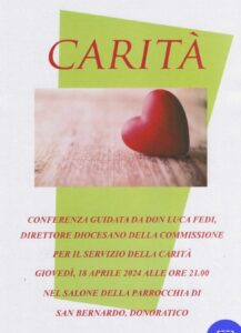 Carità – conferenza giovedì 18 Aprile Descrizione: Incontro di formazione presso la parrocchia di Donoratico san Bernardo Abate Inizio: 18/04/2024 21:00 Fine: 18/04/2024 23:00 Categorie: Parrocchie Città: Castagneto Carducci Regione: Toscana Paese: Italia 15 Aprile 202415 Aprile 2024
