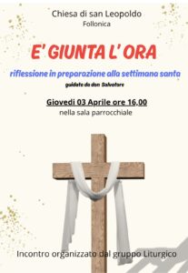 Follonica: preparazione alla settimana santa giovedì 3 Aprile Descrizione: Una riflessione in preparazione alla settimana santa guidata dal parroco. Appuntamento giovedì 3 aprile alle 16 presso la chiesa di San Leopoldo di Follonica Inizio: 03/04/2025 16:00 Fine: 03/04/2025 17:30 Categorie: Parrocchie Città: Follonica Regione: Toscana Paese: Italia 22 Marzo 202522 Marzo 2025
