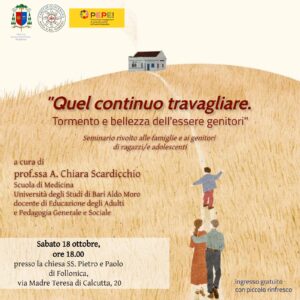 Il primo incontro è in programma sabato 18 ottobre alle ore 18.00. Si svolgerà presso la chiesa dei Santi Pietro e Paolo di Follonica ed ha come titolo “Quel continuo travagliare”. E’ rivolto a tutte le persone interessate, in particolare ai genitori e alle famiglie dei ragazzi e delle ragazze. Maggiori informazioni nella locandina allegata
