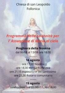 Alla Chiesa di San Leopoldo (Follonica) una serie di proposte di preghiera in occasione della Solennità dell’Assunzione di Maria al cielo. Tutto il programma nella locandina allegata.