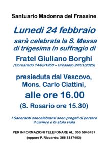 Frassine: messa di suffragio lunedì 24 Febbraio Descrizione: Lunedì 24 febbraio, alle 15.30, il nostro vescovo Carlo presiederà la messa in suffragio di fratel Giuliano Borghi. Info nella locandina Inizio: 24/02/2025 15:30 Fine: 24/02/2025 17:00 Categorie: Parrocchie, Vescovo Città: Suvereto Regione: Toscana Paese: Italia 12 Febbraio 202512 Febbraio 2025messa suffragio fratel giuliano borghi