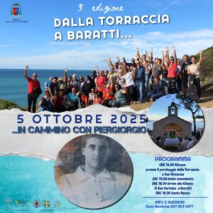 Il 5 ottobre è prevista la terza edizione della Camminata Laudato Sì dal parcheggio de La Torraccia alla chiesa di San Cerbone a Baratti. Il ritrovo è fissato alle 14.30 al parcheggio de La Torraccia. Il gruppo sarà “accompagnato” dalla figura di san Pier Giorgio Frassati cui saranno dedicate alcune riflessioni lungo il cammino. Al termine dello stesso, è prevista la celebrazione della Messa nella chiesa di San Cerbone.