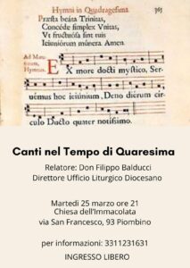 Piombino: canti nel tempo di Quaresima martedì 25 Marzo Descrizione: Iniziativa presso la parrocchia dell’Immacolata a Piombino. Info in locandina Inizio: 25/03/2025 21:00 Fine: 25/03/2025 22:30 Categorie: Parrocchie Città: Piombino Regione: Toscana Paese: Italia 4 Marzo 20254 Marzo 2025