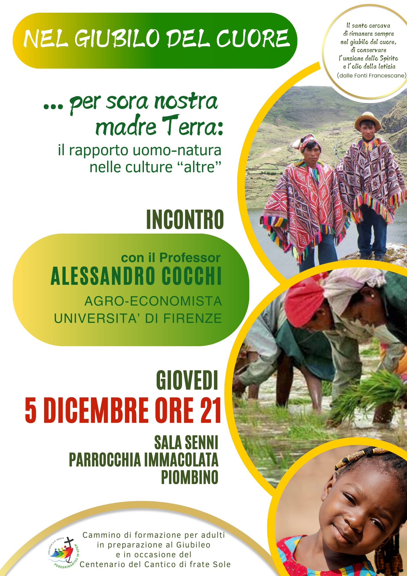 Piombino: Nel giubilo del cuore giovedì 5 Dicembre Descrizione: Incontro alla parrocchia dell’Immacolata. Info nella locandina allegata Inizio: 05/12/2024 21:00 Fine: 05/12/2024 22:00 Categorie: Parrocchie Città: Piombino Regione: Toscana Paese: Italia 3 Dicembre 20243 Dicembre 2024Locandina giubilo del cuore immacolata 2024