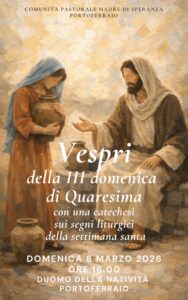 Portoferraio: Catechesi domenica 8 Marzo Descrizione: Al Duomo di Portoferraio, domenica 8 marzo alle 16, catechesi sui segni liturgici della settimana santa Inizio: 08/03/2026 16:00 Fine: 08/03/2026 18:00 Categorie: Parrocchie Città: Portoferraio Regione: Toscana Paese: Italia 4 Marzo 20264 Marzo 2026