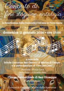 Domenica 11 gennaio a Portoferraio verrà la festa del Battesimo di Gesù con un concerto musicale a cura della Schola Cantorum San Gaetano di Marina di Campo, con la partecipazione del Coro per Caso, evento che si terrà nella chiesa di San Giuseppe, domenica 11 gennaio alle 17. Il ricavato sarà devoluto alle comunità cristiane di Terra Santa.