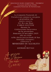 Il nostro vescovo Carlo, domenica 23 novembre, conferirà il ministero di accolito a Giorgio Retali. Inizio della celebrazione presieduta dal vescovo alle ore 11 presso la Chiesa di San Giuseppe in Carpani a Portoferraio.