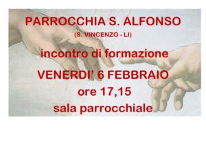 Proseguono gli incontri di catechesi promossi dalla parrocchia di Sant’Alfonso a San Vincenzo. L’appuntamento venerdì 6 febbraio alle 17.15 presso il salone parrocchiale.