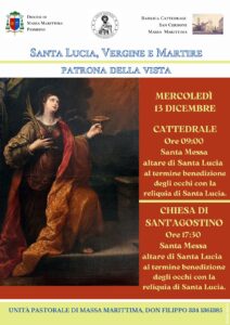 Santa Lucia mercoledì 13 Dicembre Descrizione: Celebrazione a Massa Marittima di santa Lucia, patrona della vista. Info come da locandina allegata Data: 13/12/2023 (tutto il giorno) Categorie: Diocesi Città: Massa Marittima Regione: Toscana Paese: Italia 12 Dicembre 202312 Dicembre 2023